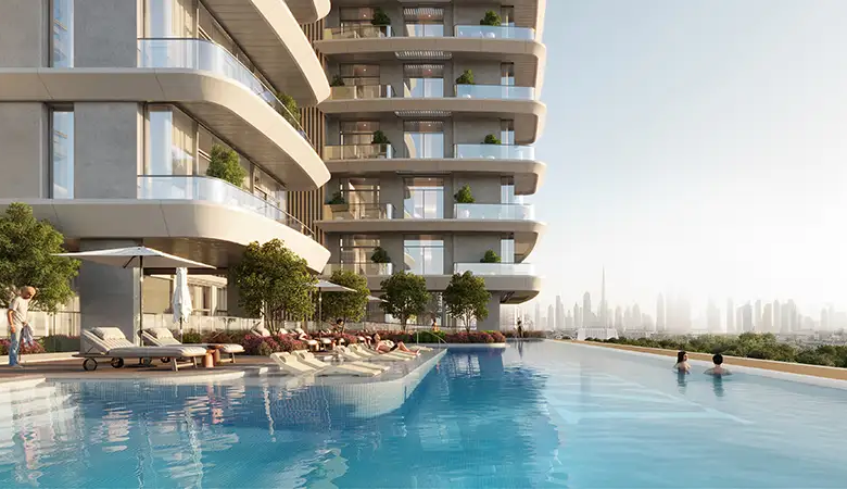 Azizi Lilly présente un design architectural inspiré par la fluidité de Dubai Creek, où la façade repose sur des lignes douces et des courbes élégantes qui confèrent au bâtiment une présence unique.